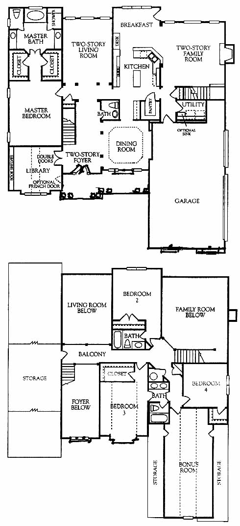 Dramatic two-story foyer entrance has a formal dining room to one side. The kitchen with walk-in pantry and island workspace overlooks the breakfast room. Two-story living and family rooms are both nice options when entertaining guests. The first-floor master includes his and her walk-in closets and a master bath with dual vanities, soaking tub and separate shower. The library at the front includes built-in bookshelves. The second floor has three more bedrooms, including one with a private bath. The bonus room rounds out this beautiful home.