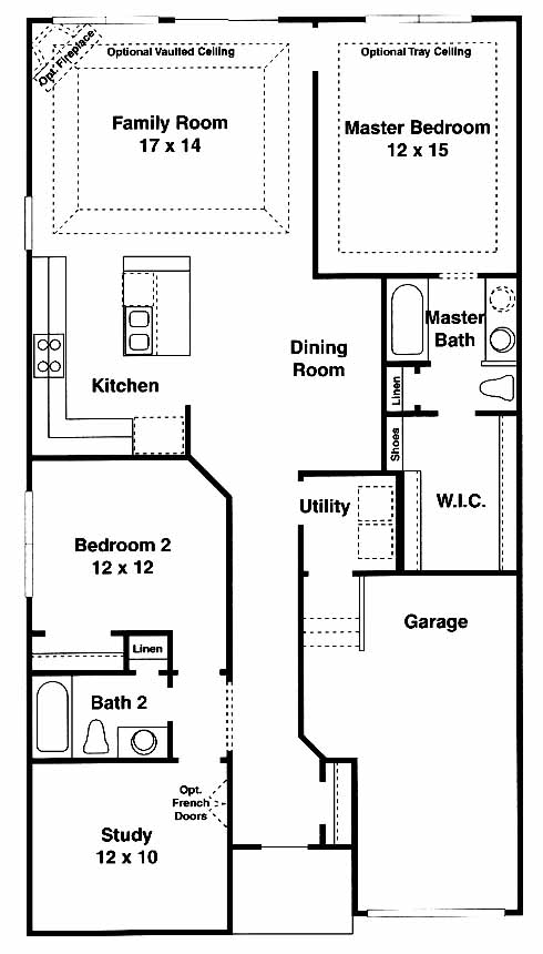 Large master bedroom includes a walk-in closet and master bath with vanity, tub and linen closet. A second bedroom toward the front shares a bath with the study. The kitchen with island workspace overlooks the dining room, while the family room nearby is a nice spot to relax on the weekend.