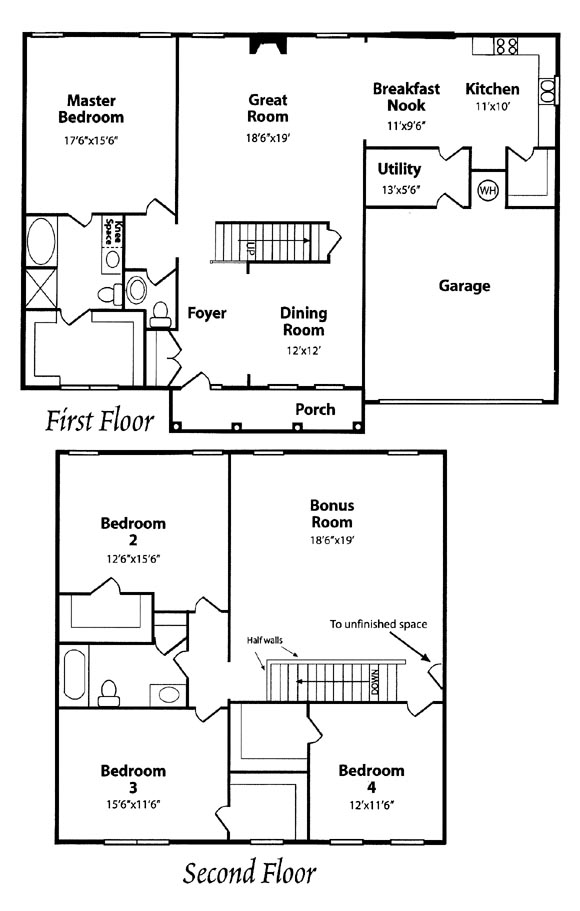 A very dramatic front porch with the old southern columns ouside and within a large foyer, dining room, large great room which joins the breakfast room and kitchen and the master suite finishes the first floor. Upstairs you find bed, bath, walk-in closets and a bonus room.