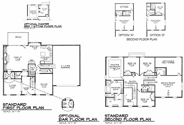 Lots of options make this plan appealing. 2 story foyer, formal living and dining room. Large pantry to kitchen with island and breakfast room. Optional bar area in passage from large den with fireplace in formal parlor. Upstairs is master suite & 3 additional bedrooms plus a bonus room with vaulted ceiling. A second staircase adds to the convenience of this very likeable plan.