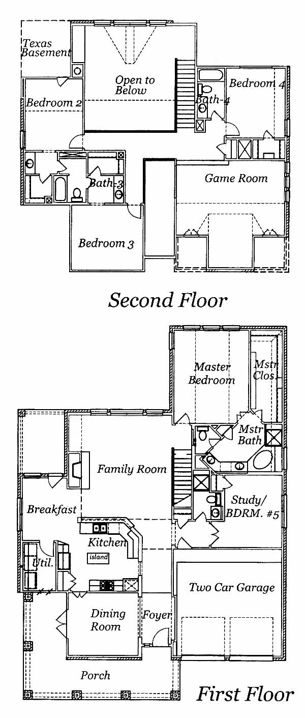 As you enter the home you'll pass the dining room and study on your way to the family room. Open to the family room is the kitchen with island, wrap around counter and breakfast nook. Also from the family room you can access the master bedroom and bath with tub, shower and walk-in closet. Upstairs you have the 2nd and 3rd bedrooms with a Jack and Jill bathroom, 4th bedroom with a hall bath, a large game room and a Texas basement.