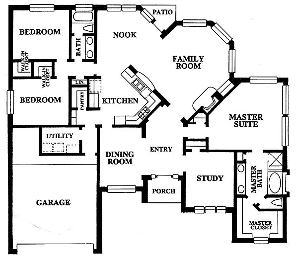 Split master, separate study, open area between family room and kitchen.