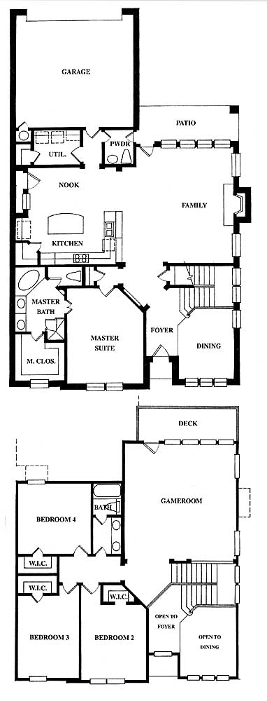 Large open kitchen, breakfast and family room, opening onto backyard patio. Upstairs game room opens onto upstairs deck overlooking beautiful backyard which is great for a pool. Several exterior elevation options available.