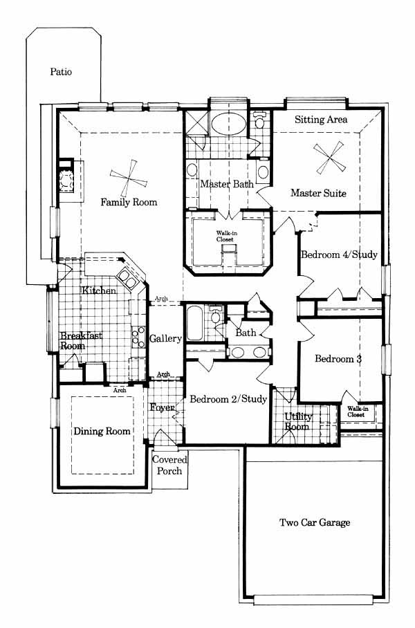 This home features a large Master Suite with sitting area, master bath and walk-in closet, three additional bedrooms or optional study instead of 4th bedroom, utility room, covered porch, dining room, kitchen with breakfast room and family room that overlooks the wrap around patio.