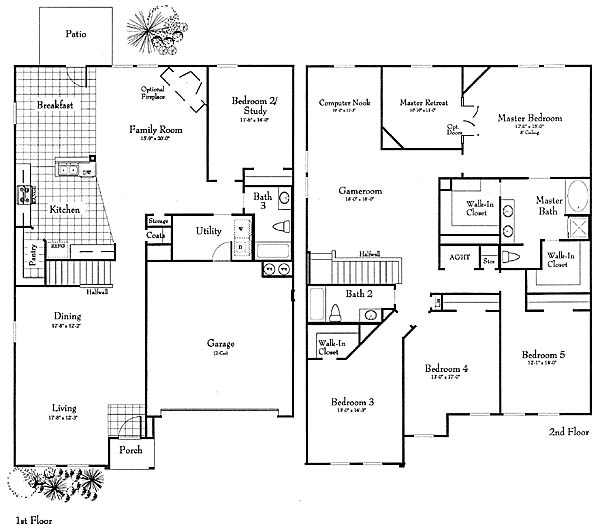 As you enter the home you'll walk through the lovely living and dining room area and into the large family room with optional fireplace. From the family room you can access the 2nd bedroom with bath and the tiled kitchen with pantry and breakfast nook. On the second floor you have the 3rd 4th and 5th bedrooms, hall bath and a huge game room with computer nook. This home also features an upstairs massive master bedroom with master retreat and a master bath with his and hers walk-in closets.