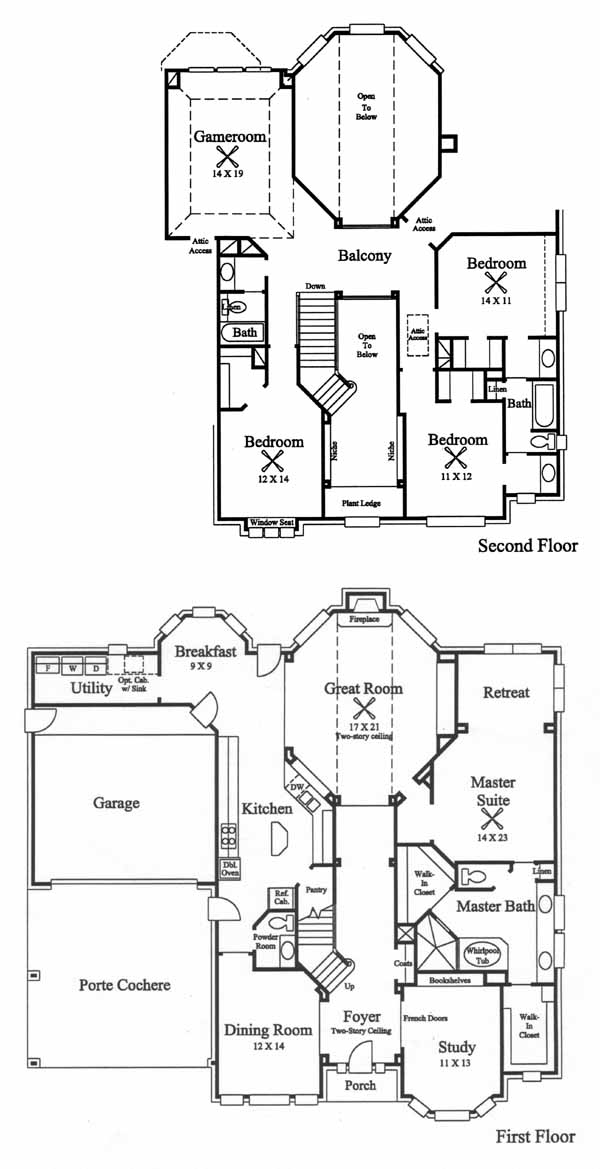 This elegant home has a port corchere to the garage! Inside the circular breakfast room adjoins the kitchen, big formal dining room, two-story ceiling in the foyer and great room, private study, huge master suite and bath, and upstairs a game room and balcony area open to below.