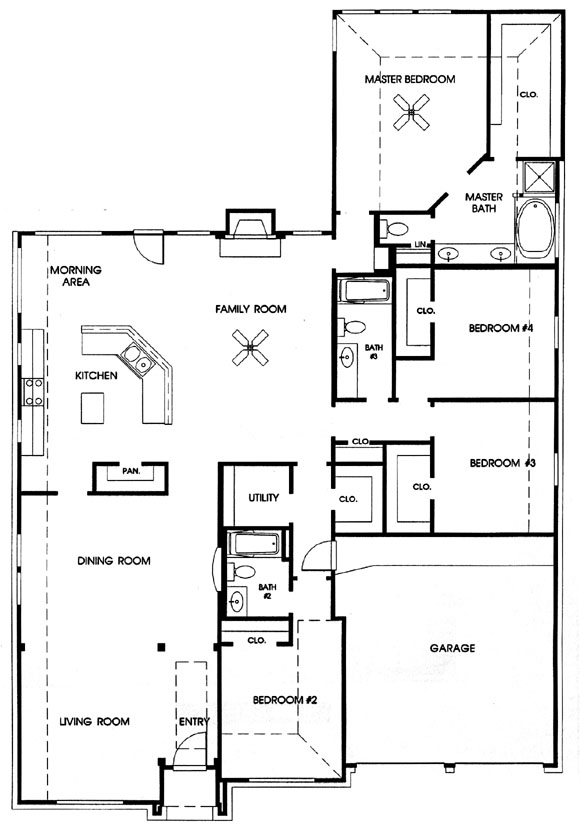 This plan has everything - island kitchen, adjoining formal dining room as well as breakfast nook. The fourth bedroom has a nearby bath and could also be used as a study. Ceramic tile in kitchen. Two-car garage.