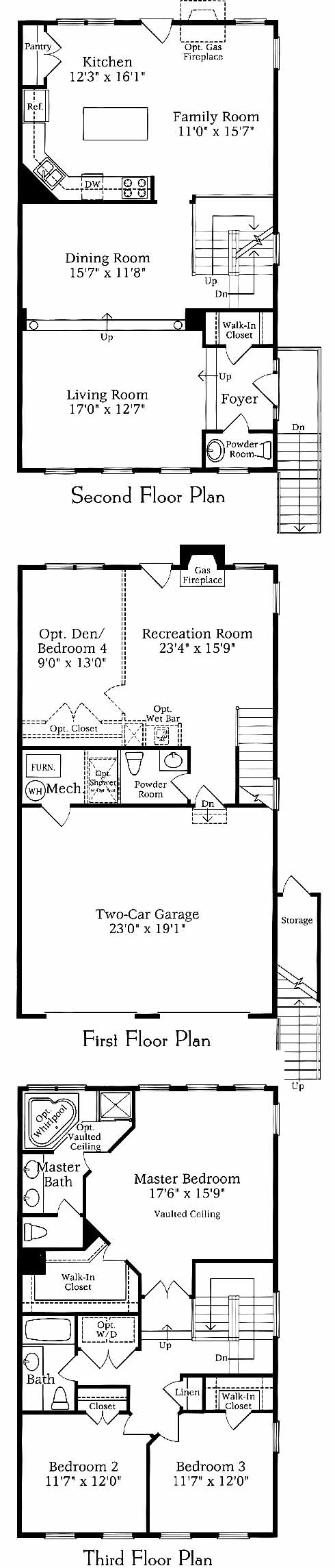 24' wide end unit with side entry. Two car garage, three finished levels. A recreational room with a gas fireplace. Second level includes an open, expansive living and dining room separated by a step and columns. A fabulous gourmet kitchen with island. Brick front standard.