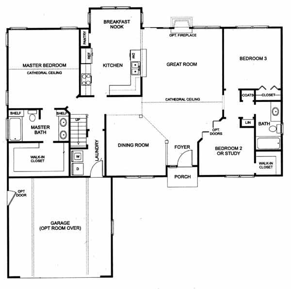 A unique great room ranch design with the master suite and family bedrooms on opposite sides for privacy. The kitchen features a pantry plus a serving bar and a sunny breakfast bay. With this home there are many options to choose from.