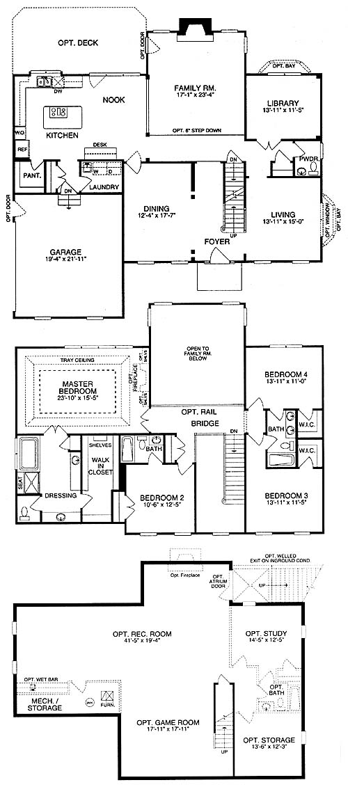 Two-story colonial home with basement. The standard floor plan includes a kitchen with breakfast area, cooktop island, pantry, desk, formal dining room, living room/parlor, family room, library, laundry and a powder room on the first level. The second floor has a large master bedroom with sitting room, walk-in closet, master bath with separate soaking tub, shower and double sinks. Side load two-car garage.