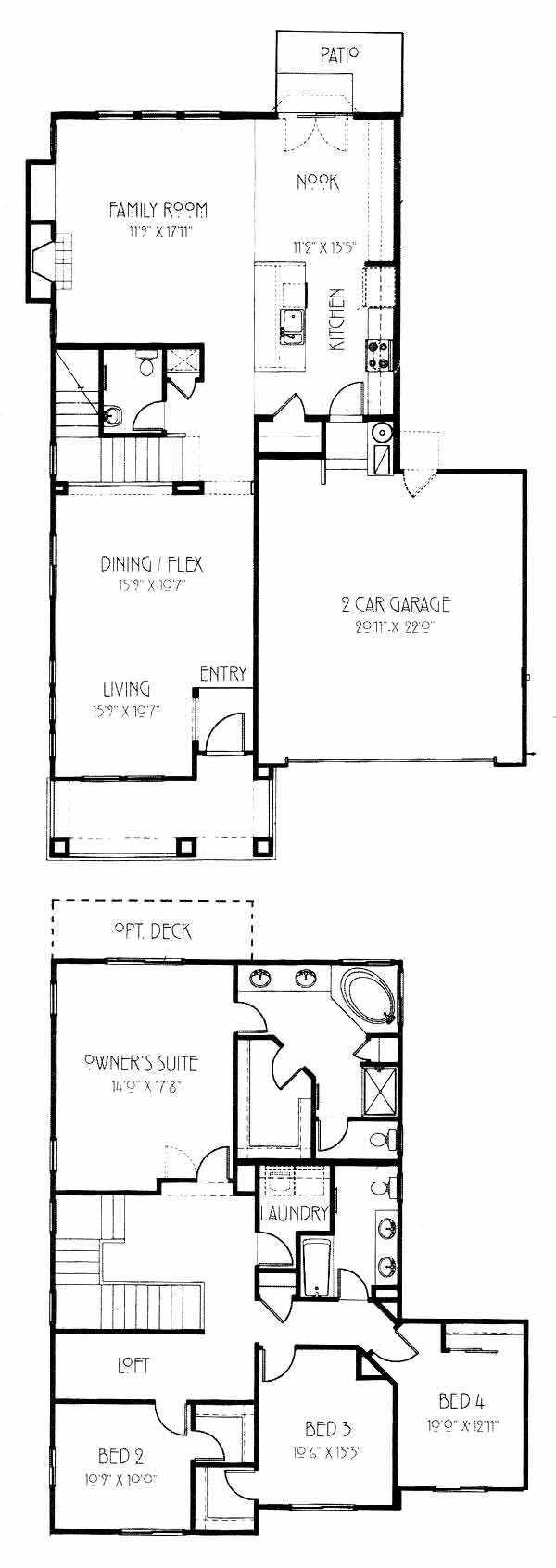 The largest of the five designs in this community, the Rose floor plan is open, full of windows for light and great for families. Master Suite includes a luxurious soaking tub and large walk-in closet. The loft upstairs is a perfect area for reading or playing.