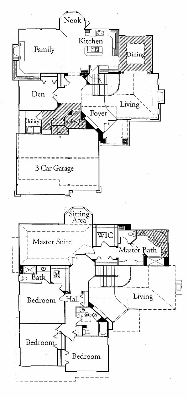 The foyer leads you past the living room with fireplace and the den and into the family room with fireplace. Open to the family room is the kitchen with island, and breakfast nook which access's the dining room. Upstairs you have the 2nd and 3rd bedrooms, 4th bedroom with bath, a hall bath with dual vanities and the massive master suite with sitting area, walk-in closet and master bath with garden tub and shower.