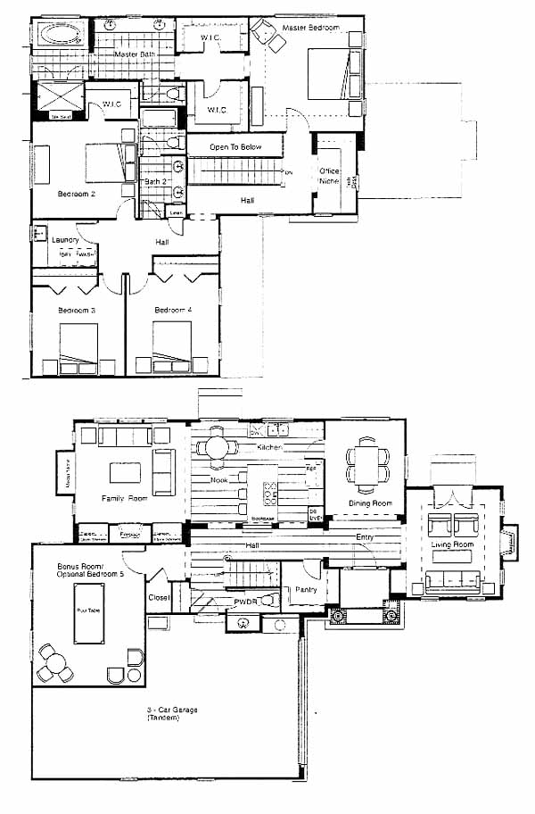 When you enter the home you'll find the living room with fireplace on your immediate right and the elegant dining room directly in front of you. Just down the hall you'll find the bonus room/optional 5th bedroom, powder room and the family room with fireplace and media niche. Open to the family room is the kitchen with pantry, breakfast bar and nook. Upstairs you have the 2nd, 3rd and 4th bedrooms, hall bath and the enormous master bedroom and bath with his and her walk-in closets and dual vanities.