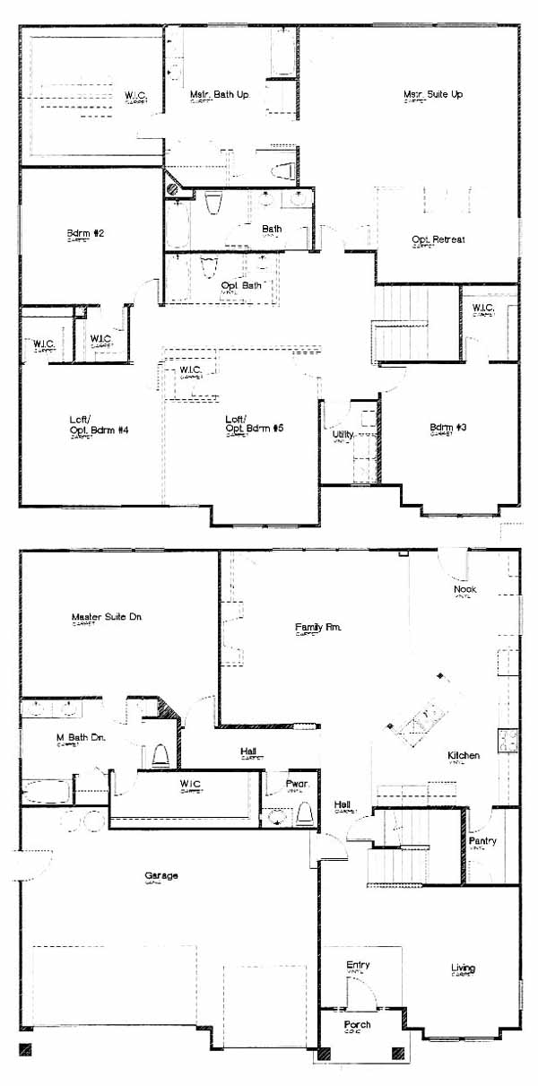 As you enter the home you'll step directly into the lovely living room. As you move down the hall you'll come to the family room with optional fireplace. Accessible from the family room is the kitchen with pantry and breakfast nook and the massive downstairs master suite and bath with dual vanities and a walk-in closet. Upstairs you'll find the 2nd and 3rd bedrooms with walk-in closets, super loft/optional 4th and 5th bedrooms and the enormous upstairs master with optional retreat, bath and massive walk-in closet. This truly is a must see home!