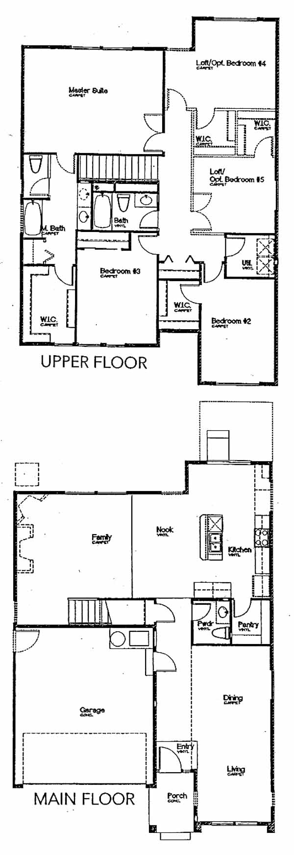 As you enter the home you'll step directly into the living and dining room area. Next you'll come to the family room with optional fireplace. Open to the family room is the large kitchen with wrap around counter and breakfast nook. Upstairs you have the 2nd and 3rd bedrooms, super loft/optional 4th and 5th bedrooms area and the master suite and bath with a walk-in closet.