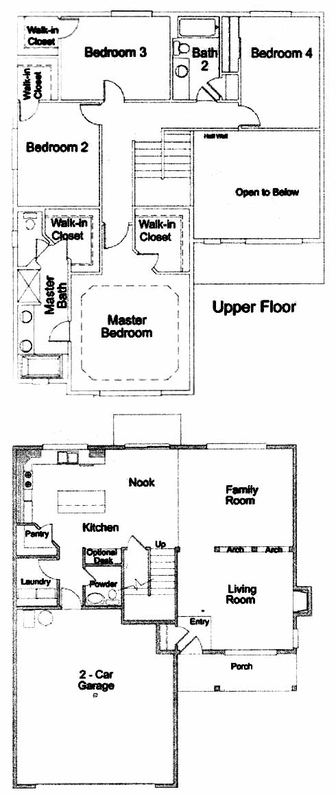 This plan features four bedrooms, with a five piece master bath adjoining the master suite. The kitchen is ready for any gourmet cook, with a large pantry, an island and eating nook. The living room has a gas fireplace and is connected to the family room by an arch detailed wall.